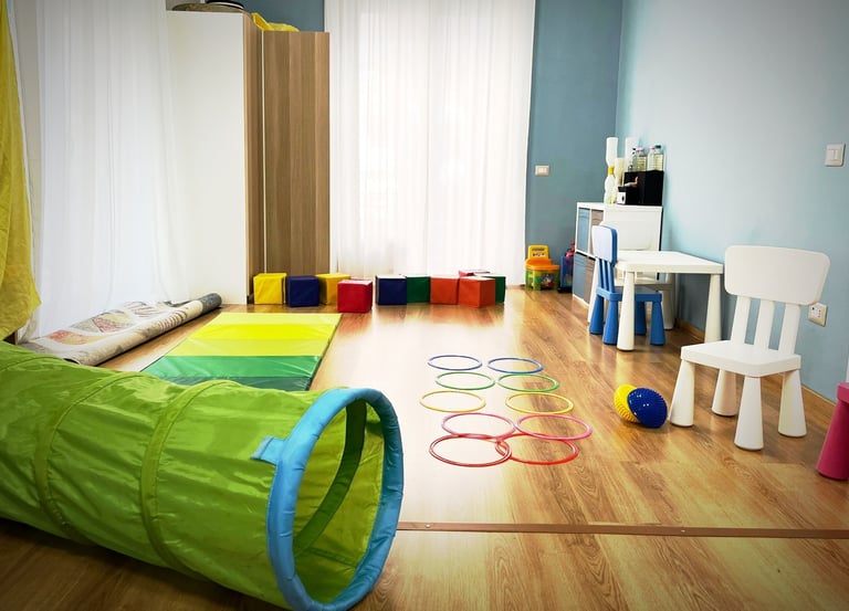 All’interno della stanza di terapia il bambino salta, costruisce, esplora, sperimenta frustrazioni e successi, in un contesto protetto e intenzionalmente strutturato.
